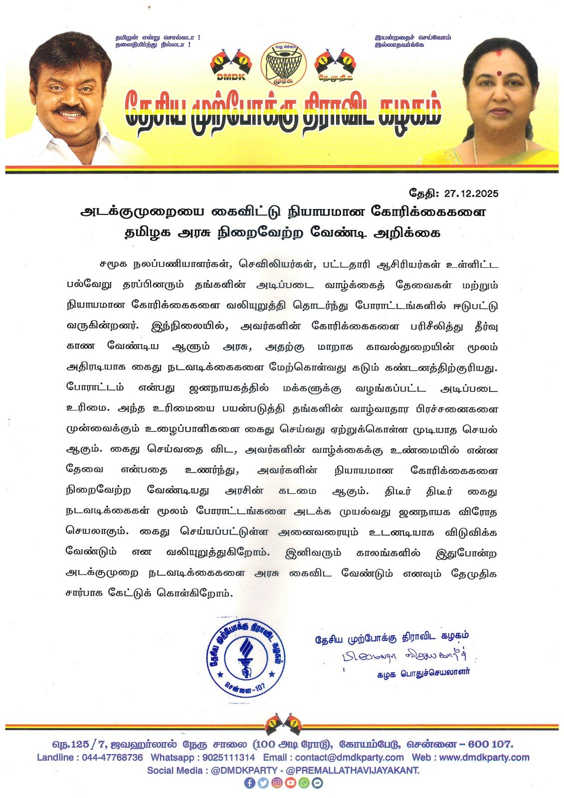 சமூக நலப்பணியாளர்கள், செவிலியர்கள், பட்டதாரி ஆசிரியர்கள் உள்ளிட்ட பல்வேறு தரப்பினரும் தங்களின் அடிப்படை வாழ்க்கைத் தேவைகள் மற்றும் நியாயமான கோரிக்கைகளை வலியுறுத்தி தொடர்ந்து போராட்டங்களில் ஈடுபட்டு வருகின்றனர். இந்நிலையில், அவர்களின் கோரிக்கைகளை பரிசீலித்து தீர்வு காண வேண்டிய ஆளும் அரசு, அதற்கு மாறாக காவல்துறையின் மூலம் அதிரடியாக கைது நடவடிக்கைகளை மேற்கொள்வது கடும் கண்டனத்திற்குரியது. போராட்டம் என்பது ஜனநாயகத்தில் மக்களுக்கு வழங்கப்பட்ட அடிப்படை உரிமை. அந்த உரிமையை பயன்படுத்தி தங்களின் வாழ்வாதார பிரச்சனைகளை முன்வைக்கும் உழைப்பாளிகளை கைது செய்வது ஏற்றுக்கொள்ள முடியாத செயல் ஆகும். கைது செய்வதை விட, அவர்களின் வாழ்க்கைக்கு உண்மையில் என்ன தேவை என்பதை உணர்ந்து, அவர்களின் நியாயமான கோரிக்கைகளை நிறைவேற்ற வேண்டியது அரசின் கடமை ஆகும். திடீர் திடீர் கைது நடவடிக்கைகள் மூலம் போராட்டங்களை அடக்க முயல்வது ஜனநாயக விரோத செயலாகும். கைது செய்யப்பட்டுள்ள அனைவரையும் உடனடியாக விடுவிக்க வேண்டும் என வலியுறுத்துகிறோம். இனிவரும் காலங்களில் இதுபோன்ற அடக்குமுறை நடவடிக்கைகளை அரசு கைவிட வேண்டும் எனவும் தேமுதிக சார்பாக கேட்டுக் கொள்கிறோம்.