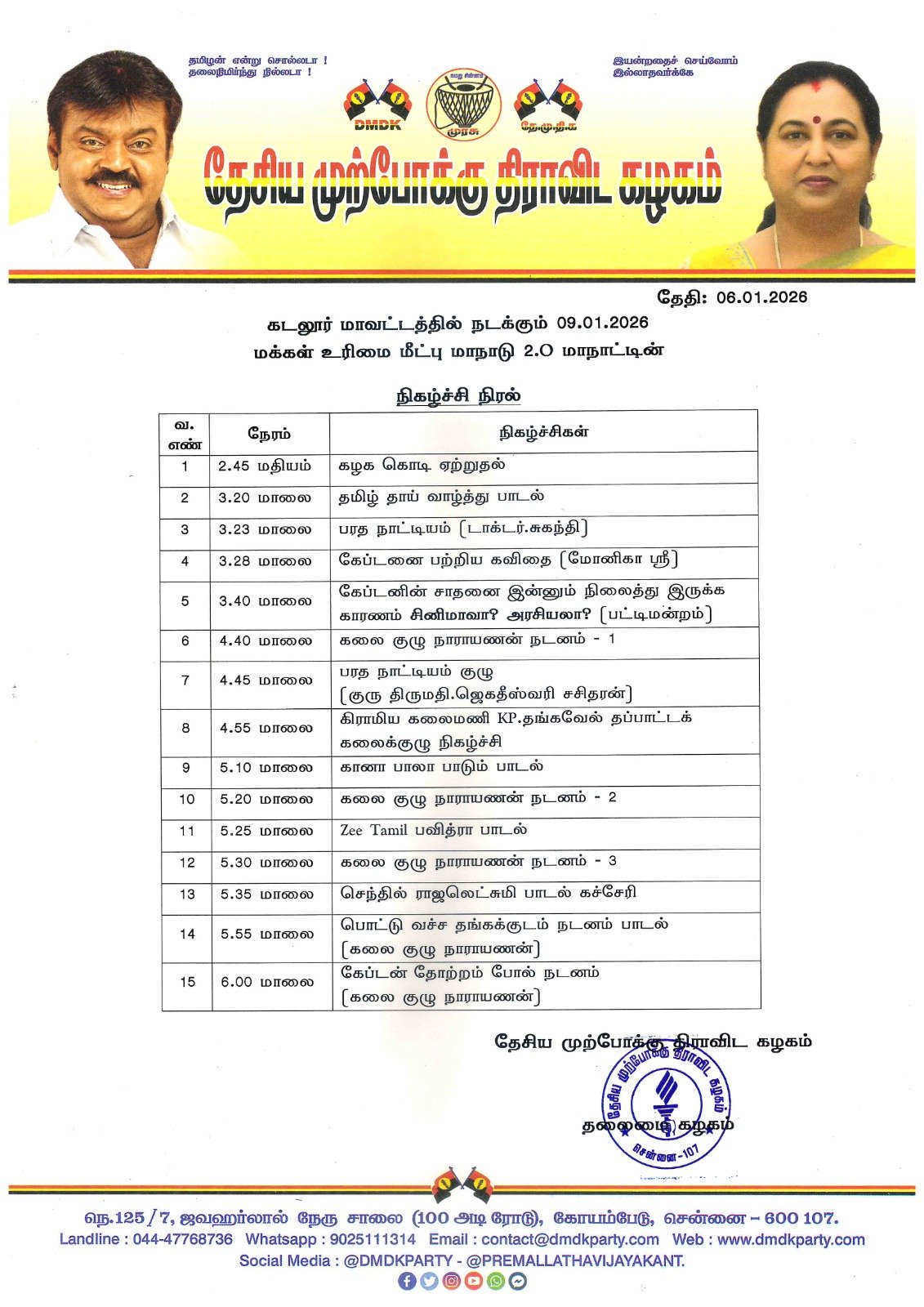 | 5 | 3.40 மாலை | கேப்டனின் சாதனை இன்னும் நிலைத்து இருக்க காரணம் சினிமாவா? அரசியலா? (பட்டிமன்றம்) |
