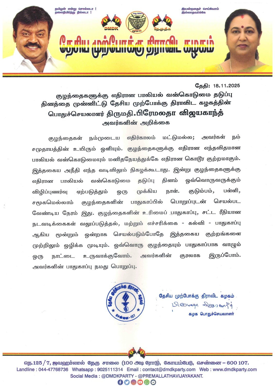 குழந்தைகள் நம்முடைய எதிர்காலம் மட்டுமல்ல; அவர்கள் நம் சமுதாயத்தின் உயிரும் ஒளியும். குழந்தைகளுக்கு எதிரான எந்தவிதமான பாலியல் வன்கொடுமையும் மனிதநேயத்துக்கே எதிரான கொடூர குற்றமாகும். இத்தகைய அநீதி எந்த வடிவிலும் நிகழக்கூடாது. இன்று குழந்தைகளுக்கு எதிரான பாலியல் வன்கொடுமை தடுப்பு தினம் ஒவ்வொருவருக்கும் விழிப்புணர்வு ஏற்படுத்தும் ஒரு முக்கிய நாள். குடும்பம், பள்ளி, சமூகமெல்லாம் குழந்தைகளின் பாதுகாப்பில் பொறுப்புடன் செயல்பட வேண்டிய நேரம் இது. குழந்தைகளின் உரிமைப் பாதுகாப்பு, சட்ட ரீதியான நடவடிக்கைகள் வலுப்படுத்தல், மற்றும் எச்சரிக்கை – கல்வி – பாதுகாப்பு ஆகிய மூன்றும் ஒன்றாக செயல்படும்போதே இத்தகைய குற்றங்களை முற்றிலும் ஒழிக்க முடியும். ஒவ்வொரு குழந்தையும் பாதுகாப்பாக வாழும் ஒரு நாட்டை உருவாக்குவோம். அவர்களின் குரலாக இருப்போம். அவர்களின் பாதுகாப்பு நமது பொறுப்பு.