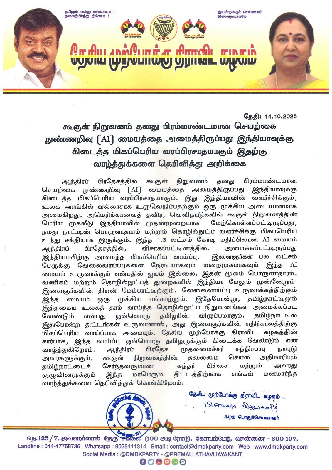 ஆந்திரப் பிரதேசத்தில் கூகுள் நிறுவனம் தனது பிரம்மாண்டமான செயற்கை நுண்ணறிவு (AI) மையத்தை அமைத்திருப்பது இந்தியாவுக்கு கிடைத்த மிகப்பெரிய வரப்பிரசாதமாகும். இது இந்தியாவின் வளர்ச்சிக்கும், உலக அரங்கில் வல்லரசாக உருவெடுப்பதற்கும் ஒரு முக்கிய அடையாளமாக அமைகிறது. அமெரிக்காவைத் தவிர, வெளிநாடுகளில் கூகுள் நிறுவனத்தின் பெரிய முதலீடு இந்தியாவில் முதன்முறையாக மேற்கொள்ளப்பட்டிருப்பது, நமது நாட்டின் பொருளாதாரம் மற்றும் தொழில்நுட்ப வளர்ச்சிக்கு மிகப்பெரிய உந்து சக்தியாக இருக்கும். இந்த 1.3 லட்சம் கோடி மதிப்பிலான AI மையம் ஆந்திரப் பிரதேசத்தில், விசாகப்பட்டினத்தில், அமைக்கப்பட்டிருப்பது இந்தியாவிற்கு அமைந்த மிகப்பெரிய வாய்ப்பு. இளைஞர்கள் பல லட்சம் பேருக்கு வேலைவாய்ப்புகளை நேரடியாகவும் மறைமுகமாகவும் இந்த AI மையம் உருவாக்கும் என்பதில் ஐயம் இல்லை. இதன் மூலம் பொருளாதாரம், வணிகம் மற்றும் தொழில்நுட்பத் துறைகளில் இந்தியா மேலும் முன்னேறும். இளைஞர்களின் திறன் மேம்பாட்டிற்கும், வேலைவாய்ப்பு உருவாக்கத்திற்கும் இந்த மையம் ஒரு முக்கிய பங்காற்றும். இதேபோன்று, தமிழ்நாட்டிலும் இத்தகைய உலகத் தரம் வாய்ந்த தொழில்நுட்ப நிறுவனங்கள் அமைக்கப்பட வேண்டும் என்பது ஒவ்வொரு தமிழரின் விருப்பமாகும். தமிழ்நாட்டில் இதுபோன்ற திட்டங்கள் உருவானால், அது இளைஞர்களின் எதிர்காலத்திற்கு மிகப்பெரிய வாய்ப்பாக அமையும். தேசிய முற்போக்கு திராவிட கழகத்தின் சார்பாக, இந்த வாய்ப்பு ஒவ்வொரு தமிழருக்கும் கிடைக்க வேண்டும் என வாழ்த்துகிறோம். ஆந்திரப் பிரதேச முதலமைச்சர் சந்திரபாபு நாயுடு அவர்களுக்கும், கூகுள் நிறுவனத்தின் தலைமை செயல் அதிகாரியும் தமிழ்நாட்டைச் சேர்ந்தவருமான சுந்தர் பிச்சை மற்றும் அவரது குழுவினருக்கும் இந்த மாபெரும் திட்டத்திற்காக எங்கள் மனமார்ந்த வாழ்த்துக்களை தெரிவித்துக் கொள்கிறோம்.