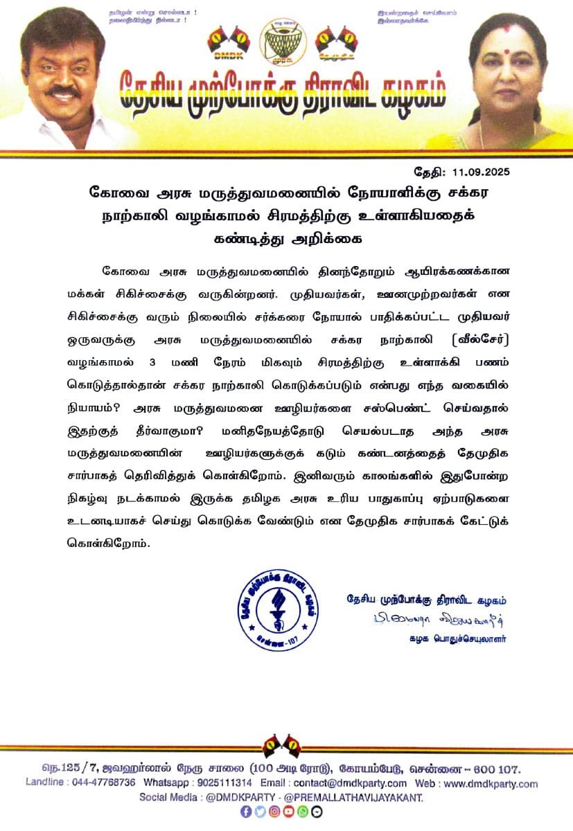 கோவை அரசு மருத்துவமனையில் தினந்தோறும் ஆயிரக்கணக்கான மக்கள் சிகிச்சைக்கு வருகின்றனர். முதியவர்கள், ஊனமுற்றவர்கள் என சிகிச்சைக்கு வரும் நிலையில் சர்க்கரை நோயால் பாதிக்கப்பட்ட முதியவர் ஒருவருக்கு அரசு மருத்துவமனையில் சக்கர நாற்காலி (வீல்சேர்) வழங்காமல் 3 மணி நேரம் மிகவும் சிரமத்திற்கு உள்ளாக்கி பணம் கொடுத்தால்தான் சக்கர நாற்காலி கொடுக்கப்படும் என்பது எந்த வகையில் நியாயம்? அரசு மருத்துவமனை ஊழியர்களை சஸ்பெண்ட் செய்வதால் இதற்குத் தீர்வாகுமா? மனிதநேயத்தோடு செயல்படாத அந்த அரசு மருத்துவமனையின் ஊழியர்களுக்குக் கடும் கண்டனத்தைத் தேமுதிக சார்பாகத் தெரிவித்துக் கொள்கிறோம். இனிவரும் காலங்களில் இதுபோன்ற நிகழ்வு நடக்காமல் இருக்க தமிழக அரசு உரிய பாதுகாப்பு ஏற்பாடுகளை உடனடியாகச் செய்து கொடுக்க வேண்டும் என தேமுதிக சார்பாகக் கேட்டுக் கொள்கிறோம்.