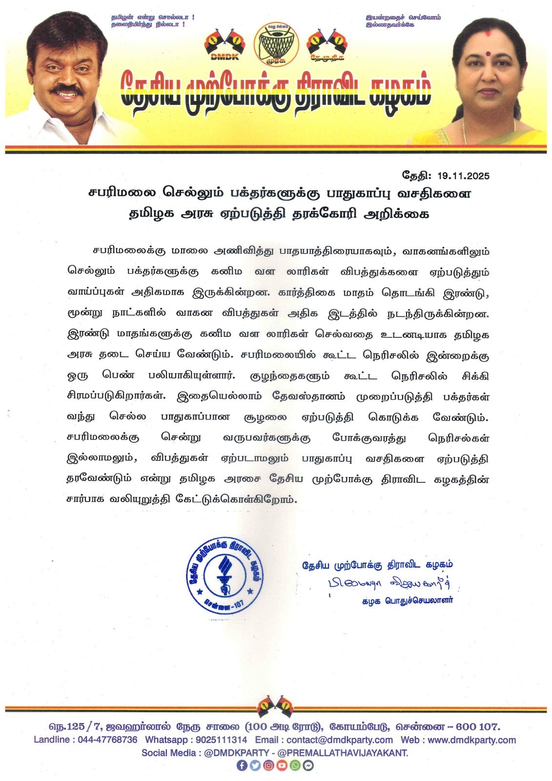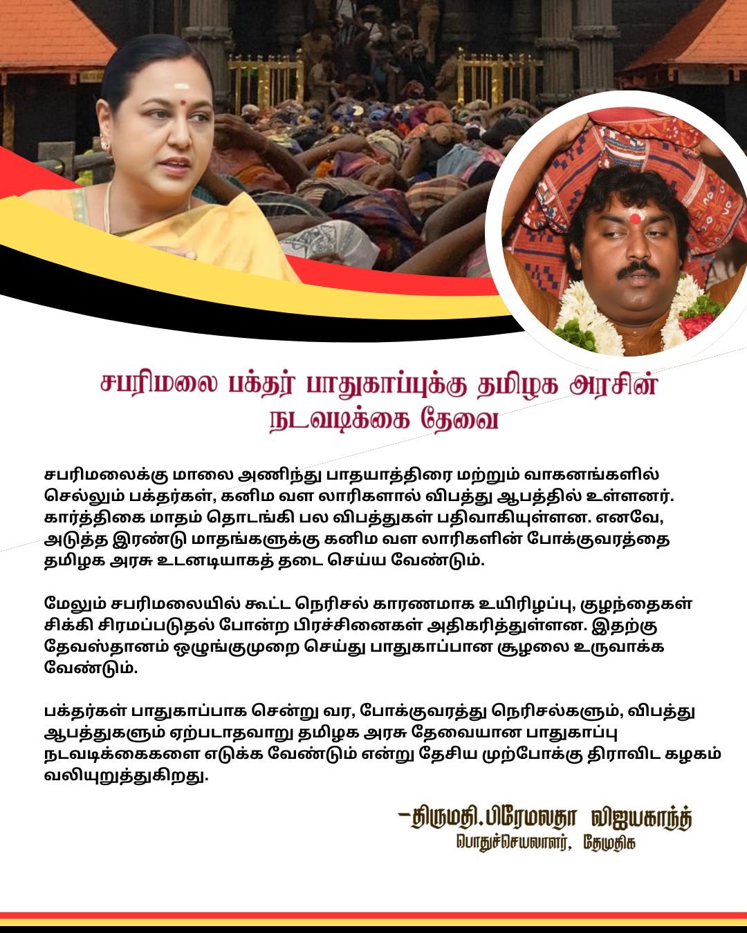 சபரிமலைக்கு மாலை அணிவித்து பாதயாத்திரையாகவும், வாகனங்களிலும் செல்லும் பக்தர்களுக்கு கனிம வள லாரிகள் விபத்துக்களை ஏற்படுத்தும் வாய்ப்புகள் அதிகமாக இருக்கின்றன. கார்த்திகை மாதம் தொடங்கி இரண்டு, மூன்று நாட்களில் வாகன விபத்துகள் அதிக இடத்தில் நடந்திருக்கின்றன. இரண்டு மாதங்களுக்கு கனிம வள லாரிகள் செல்வதை உடனடியாக தமிழக அரசு தடை செய்ய வேண்டும். சபரிமலையில் கூட்ட நெரிசலில் இன்றைக்கு ஒரு பெண் பலியாகியுள்ளார். குழந்தைகளும் கூட்ட நெரிசலில் சிக்கி சிரமப்படுகிறார்கள். இதையெல்லாம் தேவஸ்தானம் முறைப்படுத்தி பக்தர்கள் வந்து செல்ல பாதுகாப்பான சூழலை ஏற்படுத்தி கொடுக்க வேண்டும். சபரிமலைக்கு சென்று வருபவர்களுக்கு போக்குவரத்து நெரிசல்கள் இல்லாமலும், விபத்துகள் ஏற்படாமலும் பாதுகாப்பு வசதிகளை ஏற்படுத்தி தரவேண்டும் என்று தமிழக அரசை தேசிய முற்போக்கு திராவிட கழகத்தின் சார்பாக வலியுறுத்தி கேட்டுக்கொள்கிறோம்.