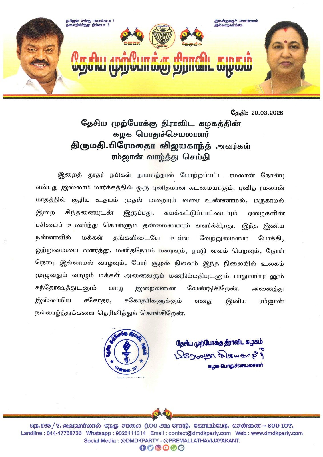 இறைத் தூதர் நபிகள் நாயகத்தால் போற்றப்பட்ட ரமலான் நோன்பு என்பது இஸ்லாம் மார்க்கத்தில் ஒரு புனிதமான கடமையாகும். புனித ரமலான் மாதத்தில் சூரிய உதயம் முதல் மறையும் வரை உண்ணாமல், பருகாமல் இறை சிந்தனையுடன் இருப்பது. சுயக்கட்டுப்பாட்டையும் ஏழைகளின் பசியைப் உணர்ந்து கொள்ளும் தன்மையையும் வளர்க்கிறது. இந்த இனிய நன்னாளில் மக்கள் தங்களிடையே உள்ள வேற்றுமையை போக்கி, ஒற்றுமையை வளர்த்து, மனிதநேயம் மலரவும், நாடு வளம் பெறவும், நோய் நொடி இல்லாமல் வாழவும், போர் சூழல் நிலவும் இந்த நிலையில் உலகம் முழுவதும் வாழும் மக்கள் அனைவரும் மனநிம்மதியுடனும் பாதுகாப்புடனும் சந்தோஷத்துடனும் வாழ இறைவனை வேண்டுகிறேன். அனைத்து இஸ்லாமிய சகோதர, சகோதரிகளுக்கும் எனது இனிய ரம்ஜான் நல்வாழ்த்துக்களை தெரிவித்துக் கொள்கிறேன்.