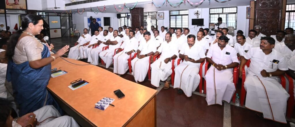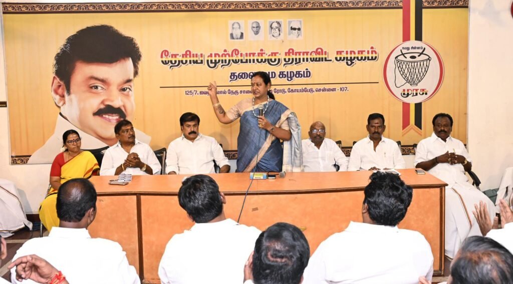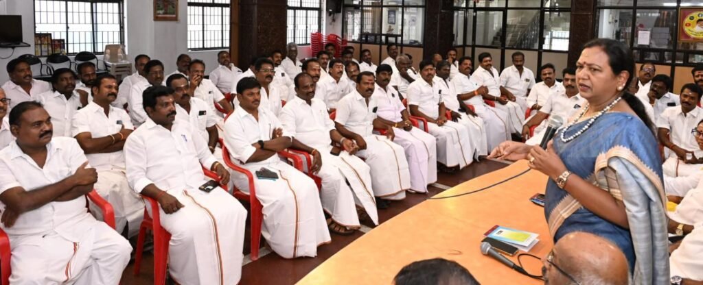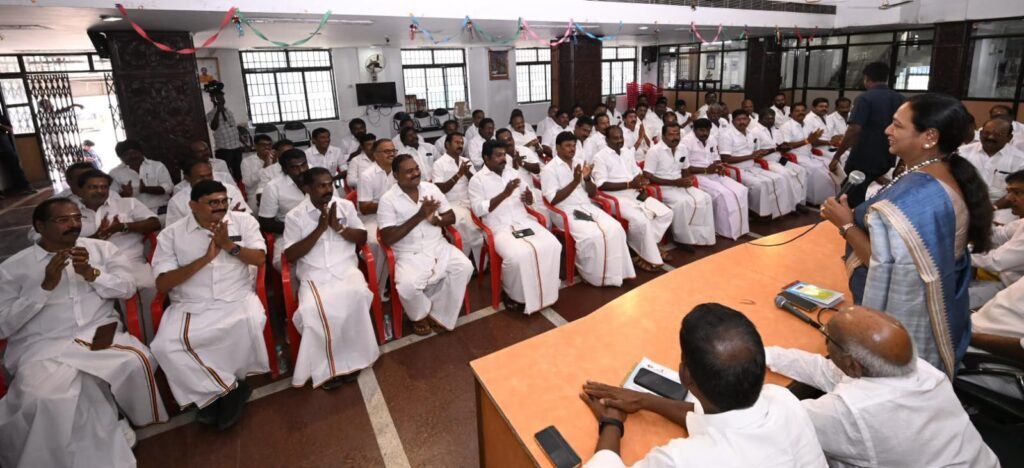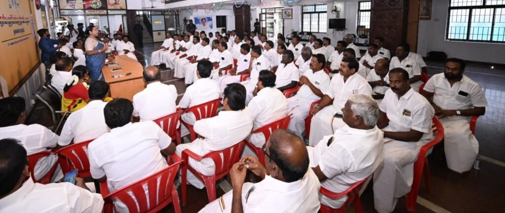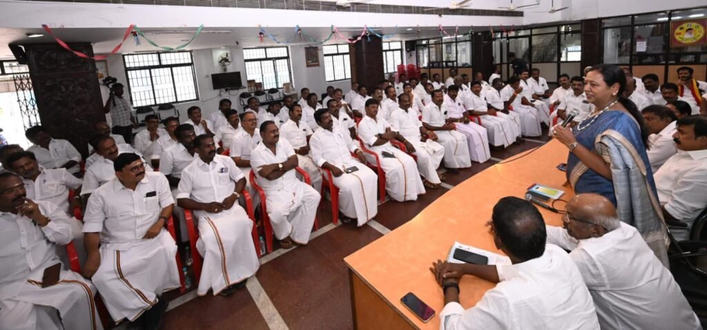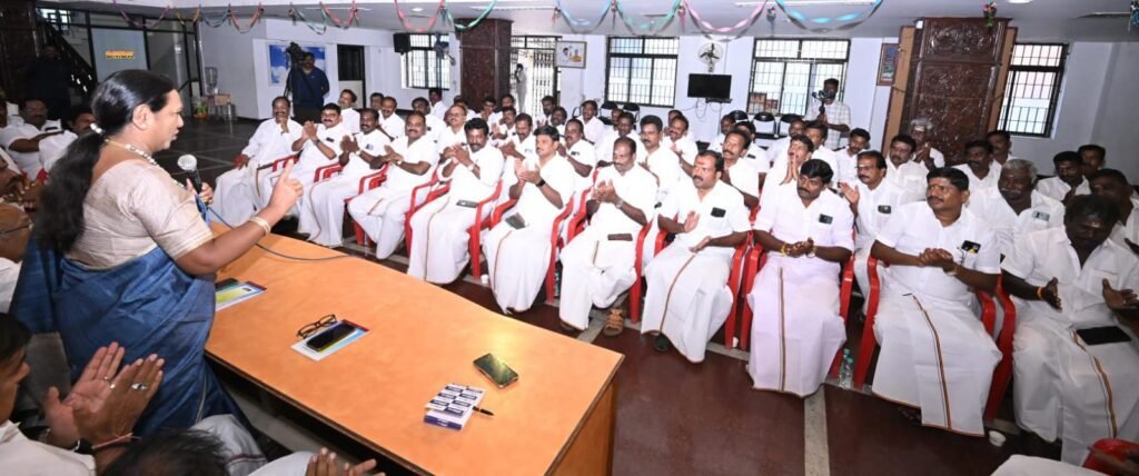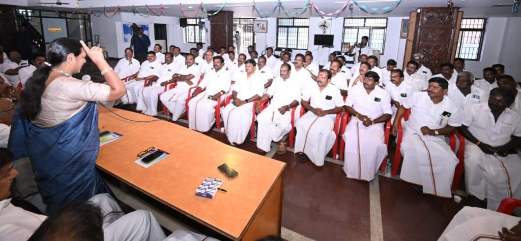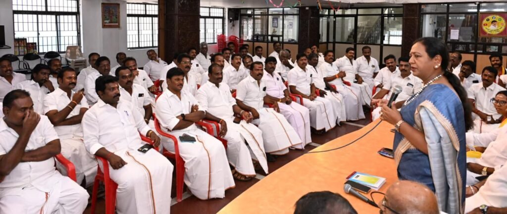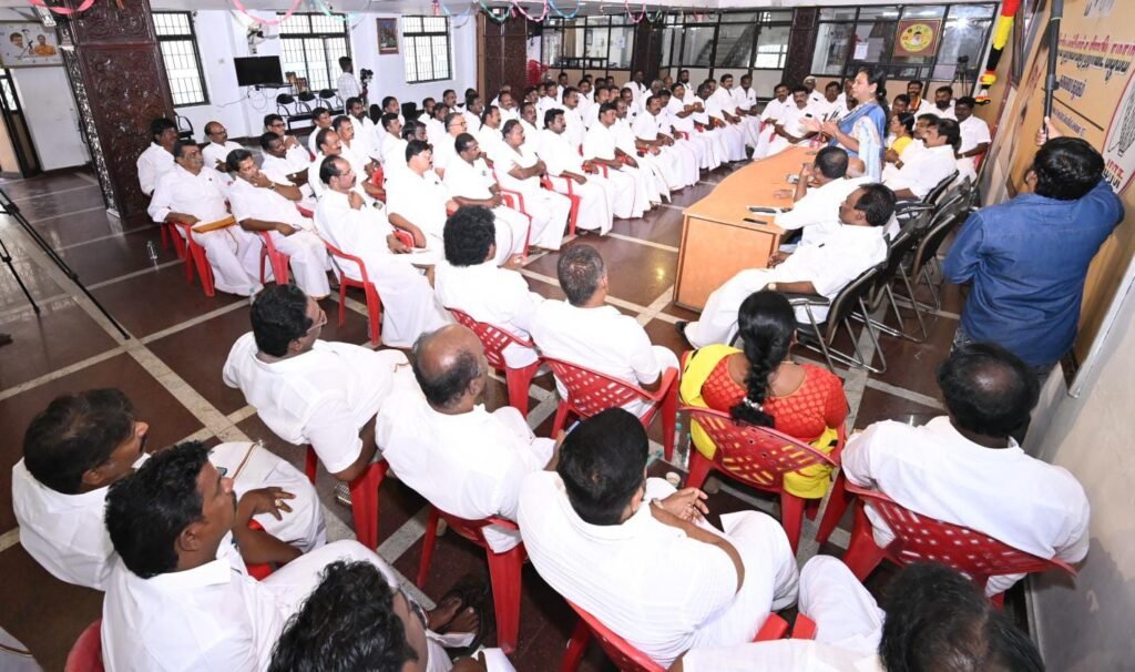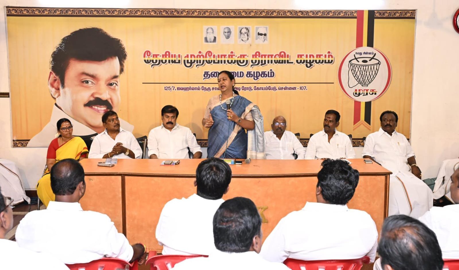 தேசிய முற்போக்கு திராவிட கழகத்தின், மாவட்ட கழக செயலாளர்கள் ஆலோசனை கூட்டம், புரட்சி அண்ணியார், கழக பொதுச்செயலாளர் திருமதி.பிரேமலதா விஜயகாந்த் அவர்களின் தலைமையில் இன்று (23.03.2026) திங்கள் கிழமை காலை 10.00 மணியளவில் சென்னை கோயம்பேட்டில் உள்ள தலைமை அலுவலகத்தில் (கேப்டன் ஆலயம்) நடைபெற்றது. இந்த ஆலோசனை கூட்டத்தில் கழக அவைத்தலைவர் டாக்டர்.திரு.வி.இளங்கோவன் அவர்கள், கழக பொருளாளர் திரு.எல்.கே.சுதீஷ்,MP., அவர்கள், கழக தலைமை நிலையச்செயலாளர் திரு.ப.பார்த்தசாரதி,Ex:MLA., அவர்கள், கழக துணைச் செயலாளர்கள் திரு.எம்.ஆர்.பன்னீர்செல்வம்,M.A.,BL., அவர்கள், திரு.SSS.U.சந்திரன் அவர்கள், திருமதி.சுபா ரவி,Ex:MLA., அவர்கள், அனைத்து மாவட்ட கழக செயலாளர்கள் அனைவரும் கலந்துகொண்டனர்.