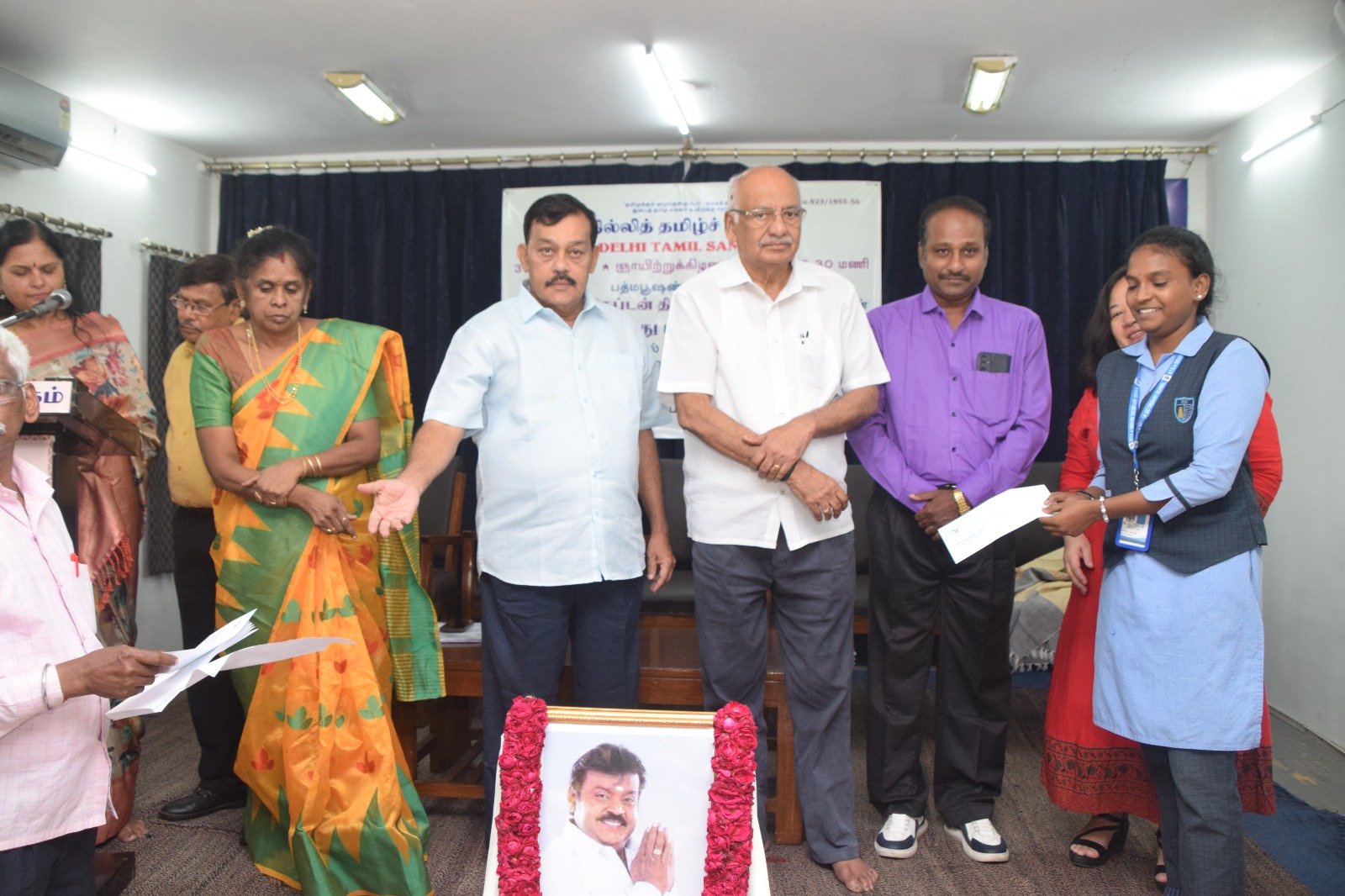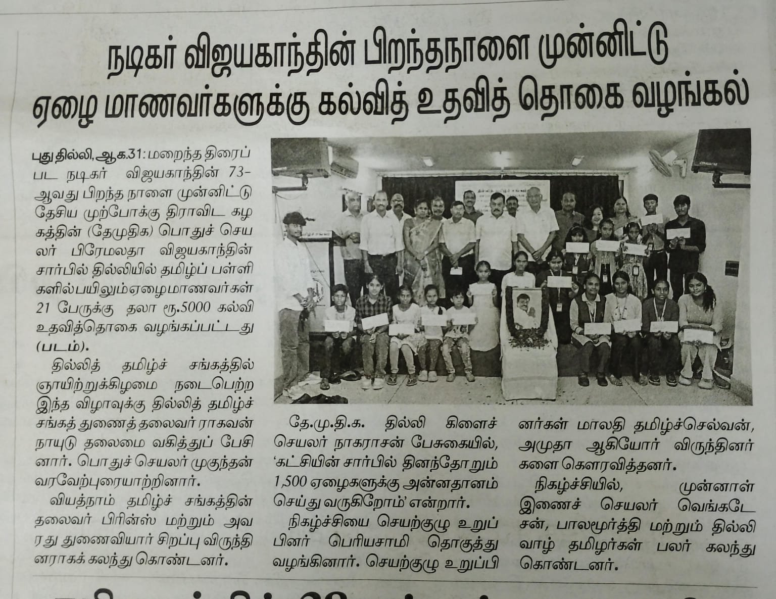 தேசிய முற்போக்கு திராவிட கழக நிறுவனத்தலைவர் பத்மபூஷன் கேப்டன் விஜயகாந்த் அவர்களின் பிறந்த நாள் ஆகஸ்ட் 25 “வறுமை ஒழிப்பு தினமாக” தேமுதிக கடைப்பிடித்து வருகிறது. வறுமை ஒழிப்பு தினத்தை முன்னிட்டு (24.08.2025) அன்று புரட்சி அண்ணியார் கழக பொதுச் செயலாளர் திருமதி.பிரேமலதா விஜயகாந்த் அவர்கள் பல்வேறு நலத்திட்ட உதவிகள் வழங்கும் நிகழ்ச்சியில் புதுடெல்லியில் உள்ள டெல்லி தமிழ் சங்கத்திற்கு ஏழை மாணவ மாணவிகளுக்கு கல்வி உதவிக்காக 1 இலட்சம் காசோலை வழங்கினார். அதை புதுடெல்லியில் தமிழ் சங்கம் பொதுச் செயலாளர் திரு.இரா.முகுந்தன் அவர்கள் டெல்லியில் ஏழை, எளிய பள்ளி மாணவ, மாணவிகளுக்கு கல்வி உதவித்தொகையை வழங்கினார்.