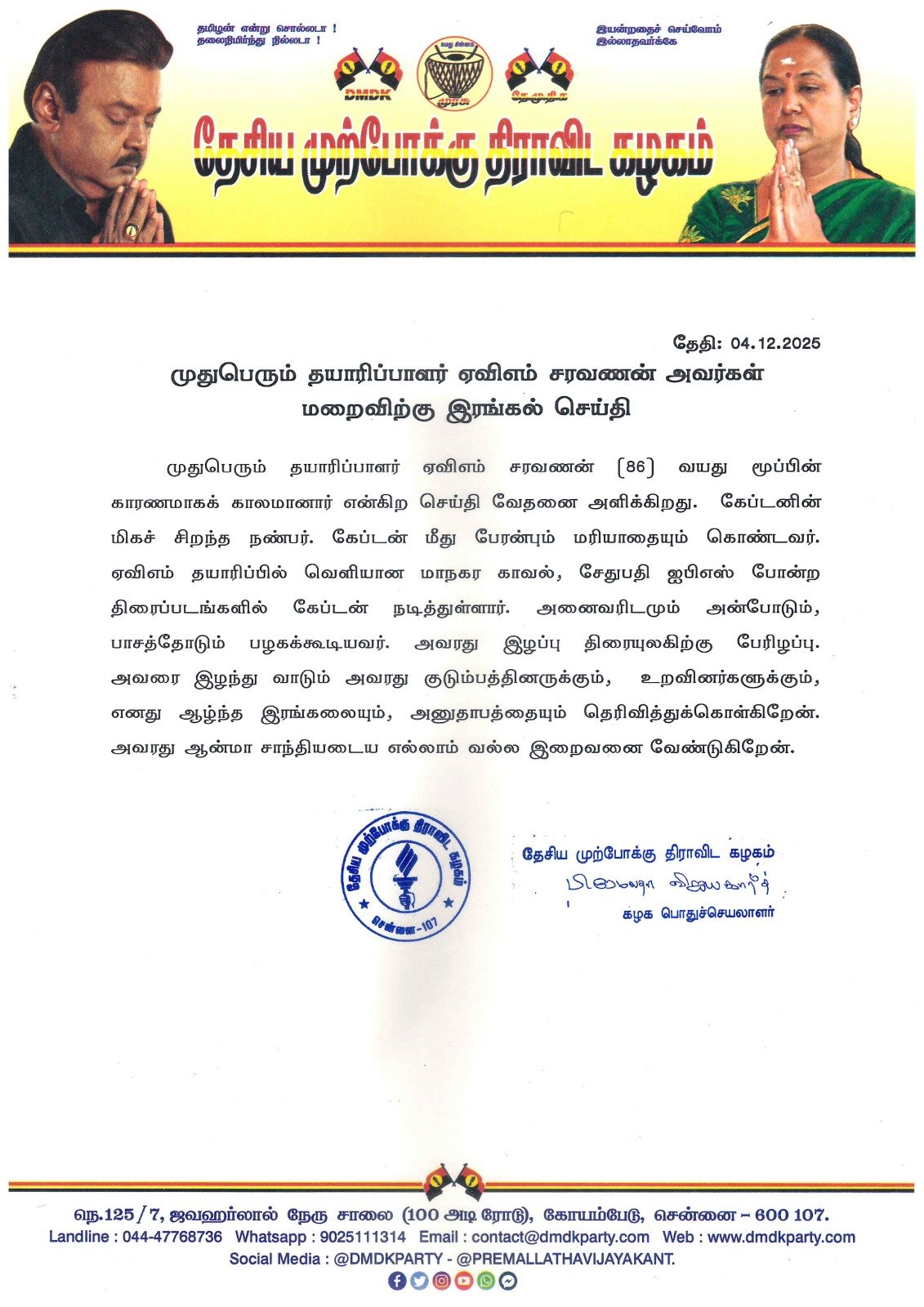 முதுபெரும் தயாரிப்பாளர் ஏவிஎம் சரவணன் (86) வயது மூப்பின் காரணமாகக் காலமானார் என்கிற செய்தி வேதனை அளிக்கிறது. கேப்டனின் மிகச் சிறந்த நண்பர். கேப்டன் மீது பேரன்பும் மரியாதையும் கொண்டவர். ஏவிஎம் தயாரிப்பில் வெளியான மாநகர காவல், சேதுபதி ஐபிஎஸ் போன்ற திரைப்படங்களில் கேப்டன் நடித்துள்ளார். அனைவரிடமும் அன்போடும், பாசத்தோடும் பழகக்கூடியவர். அவரது இழப்பு திரையுலகிற்கு பேரிழப்பு. அவரை இழந்து வாடும் அவரது குடும்பத்தினருக்கும், உறவினர்களுக்கும், எனது ஆழ்ந்த இரங்கலையும், அனுதாபத்தையும் தெரிவித்துக்கொள்கிறேன். அவரது ஆன்மா சாந்தியடைய எல்லாம் வல்ல இறைவனை வேண்டுகிறேன்.