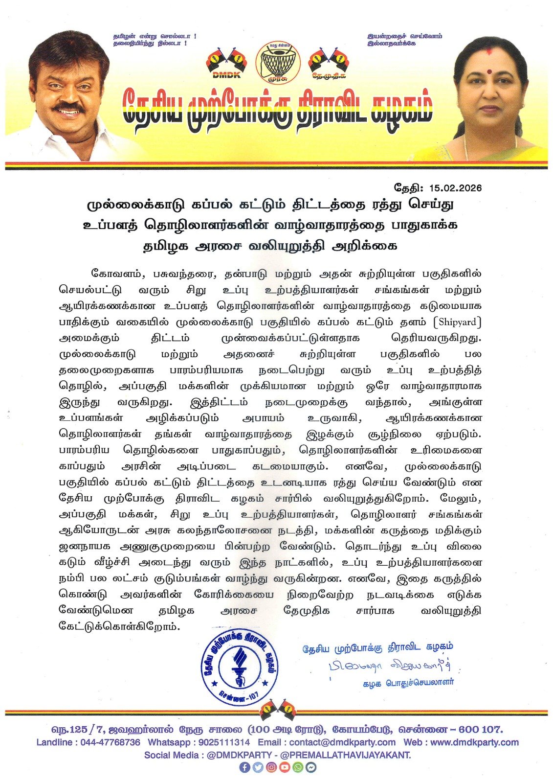கோவளம், பசுவந்தரை, தன்பாடு மற்றும் அதன் சுற்றியுள்ள பகுதிகளில் செயல்பட்டு வரும் சிறு உப்பு உற்பத்தியாளர்கள் சங்கங்கள் மற்றும் ஆயிரக்கணக்கான உப்பளத் தொழிலாளர்களின் வாழ்வாதாரத்தை கடுமையாக பாதிக்கும் வகையில் முள்ளக்காடு பகுதியில் கப்பல் கட்டும் தளம் (Shipyard) அமைக்கும் திட்டம் முன்வைக்கப்பட்டுள்ளதாக தெரியவருகிறது. முல்லைக்காடு மற்றும் அதனைச் சுற்றியுள்ள பகுதிகளில் பல தலைமுறைகளாக பாரம்பரியமாக நடைபெற்று வரும் உப்பு உற்பத்தித் தொழில், அப்பகுதி மக்களின் முக்கியமான மற்றும் ஒரே வாழ்வாதாரமாக இருந்து வருகிறது. இத்திட்டம் நடைமுறைக்கு வந்தால், அங்குள்ள உப்பளங்கள் அழிக்கப்படும் அபாயம் உருவாகி, ஆயிரக்கணக்கான தொழிலாளர்கள் தங்கள் வாழ்வாதாரத்தை இழக்கும் சூழ்நிலை ஏற்படும். பாரம்பரிய தொழில்களை பாதுகாப்பதும், தொழிலாளர்களின் உரிமைகளை காப்பதும் அரசின் அடிப்படை கடமையாகும். எனவே, முல்லைக்காடு பகுதியில் கப்பல் கட்டும் திட்டத்தை உடனடியாக ரத்து செய்ய வேண்டும் என தேசிய முற்போக்கு திராவிட கழகம் சார்பில் வலியுறுத்துகிறோம். மேலும், அப்பகுதி மக்கள், சிறு உப்பு உற்பத்தியாளர்கள், தொழிலாளர் சங்கங்கள் ஆகியோருடன் அரசு கலந்தாலோசனை நடத்தி, மக்களின் கருத்தை மதிக்கும் ஜனநாயக அணுகுமுறையை பின்பற்ற வேண்டும். தொடர்ந்து உப்பு விலை கடும் வீழ்ச்சி அடைந்து வரும் இந்த நாட்களில், உப்பு உற்பத்தியாளர்களை நம்பி பல லட்சம் குடும்பங்கள் வாழ்ந்து வருகின்றன. எனவே, இதை கருத்தில் கொண்டு அவர்களின் கோரிக்கையை நிறைவேற்ற நடவடிக்கை எடுக்க வேண்டுமென தமிழக அரசை தேமுதிக சார்பாக வலியுறுத்தி கேட்டுக்கொள்கிறோம்.
