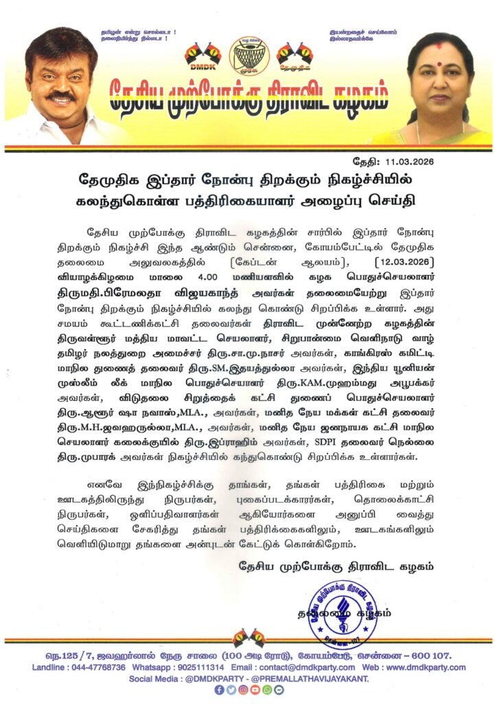 தேசிய முற்போக்கு திராவிட கழகத்தின் சார்பில் இப்தார் நோன்பு திறக்கும் நிகழ்ச்சி இந்த ஆண்டும் சென்னை, கோயம்பேட்டில் தேமுதிக தலைமை அலுவலகத்தில் (கேப்டன் ஆலயம்), (12.03.2026) வியாழக்கிழமை மாலை 4.00 மணியளவில் […]